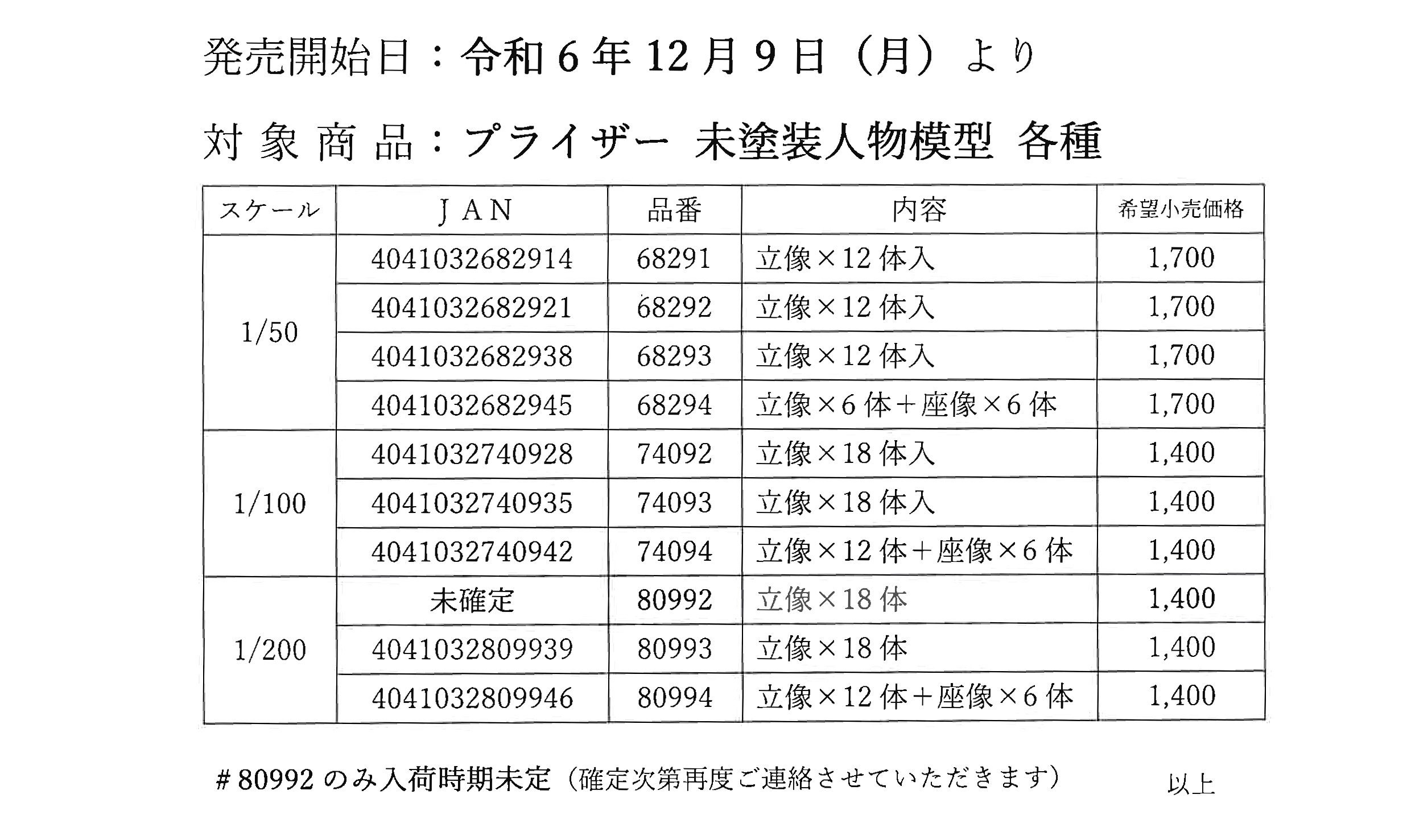 プライザー社の未塗装人物模型におきまして、下記品番の取り扱いを開始いたします。 入数が少なくなり、以前の品番よりもお買い求めやすい価格帯となっております。 弊社定番品『アクリル模型』と合わせてぜひご検討ください。