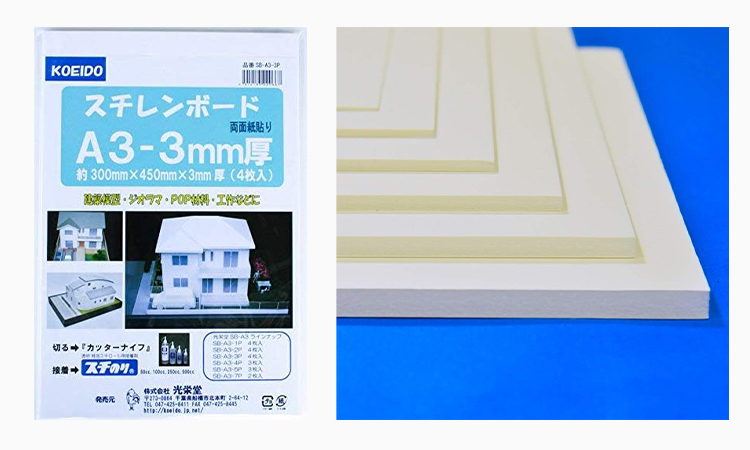 住宅模型の基礎となる材料として最も重要なのが、スチレンボードです。光栄堂のスチレンボードは、精密な切断が可能で歪みが少ないため、正確な住宅模型作りに最適です。特に建築模型用に開発された製品は、一般的な画材用のスチレンボードと比べて、以下の特徴があります。